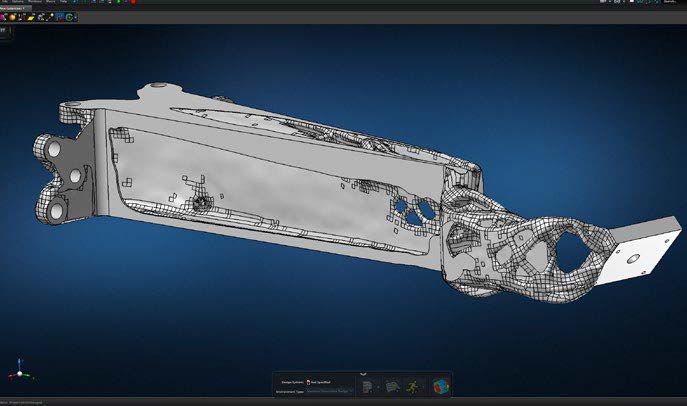 為了驗證優化後的數據和整體幾何結構,我們使用 MSC Apex Structures 再次進行檢查。透過 MSC Apex Generative Design 的新功能,將生成式設計的仿生結構結果透過「Mesh to CAD」功能轉換為實體 NURBS 曲線模型,這樣的轉換不僅方便,還能讓優化結果輕鬆匯入 MSC Apex Structures 進行進一步分析。