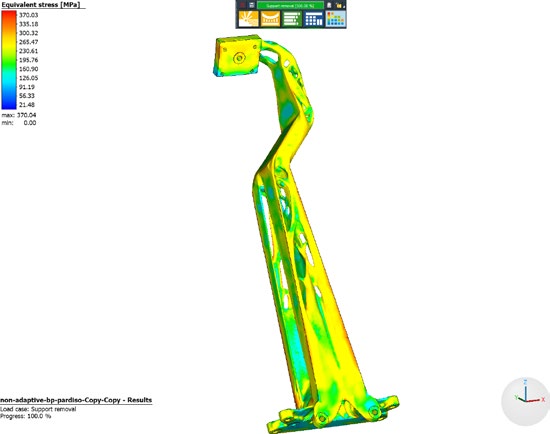 在製造方面,我們使用 Simufact Additive 進行可製造性檢查。軟體中的方向建議功能顯示,該結構需以稍微傾斜的直立方式放置,這樣才能適應製造機台內的建造空間,特別是由於感測器臂的長度較長。TRUMPF 的 TruPrint 3000 是這項任務的理想選擇,這是一台中型通用機台,具備工業級零件與粉末管理功能,專為靈活量產複雜金屬零件而設計。此外,模擬結果也保證了製造過程中不會在零件本體上生成支撐結構。軟體進一步優化了支撐結構設計,並進行了詳細分析,以確保列印結果完美無瑕,且不會出現任何製造問題。