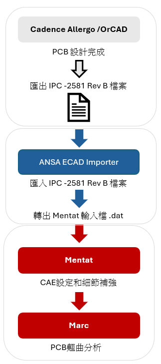 現在,我們明確知道要解決 PCB 翹曲問題,也知道了翹曲產生的原因和分析上的挑戰,因此選用 Marc 來作為分析求解工具。那麼,該怎麼把 PCB 的模型,從原始設計軟體轉換到 Marc的前後處理軟體 – Mentat 作進一步設定呢?